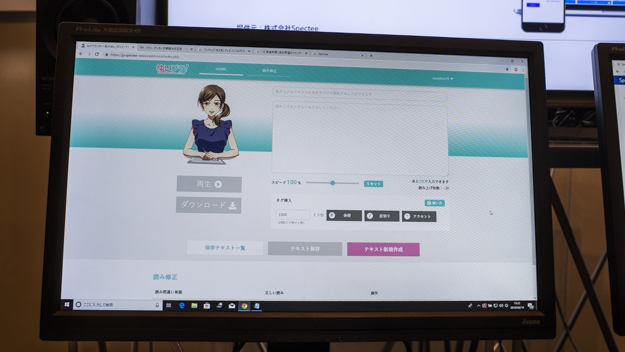 AIアナウンサーも見逃せない展示だった。設定したテキストベースの原稿を女性の声で読み上げるシステムで、サービスはフリーのAIアナウンサーという位置づけで提供されている。実際に喋りを聞いてみると、想像以上にきれいな発音で実際の人が喋っている品質に近かった。