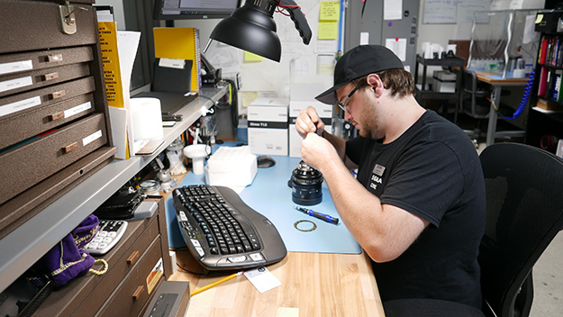 サービス施設では、レンズテクニシャンのJordan Smith氏がレンズをメンテナンス中