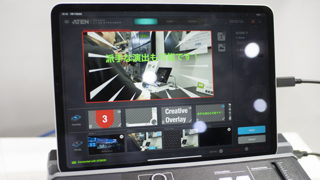 編集機能がUC9020の大きな特徴で、一般的なストリーミング配信の現場では、素材を事前に作り込んでおいて、それらを本体にアップロードして配信の際に使う。UC9020は、配信の途中でも間違いに気がついたり、演出を変更したい場合に、iPadで編集可能。