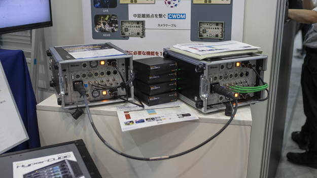 THUNDERS 4K8Kは、光波長多重技術により、3G-SDI、12G-SDおよびその他音声信号や接点を1本のカメラケーブルで伝送する装置。1本の光カメラケーブルにまとめることで、ブースでは1mだが10mや100mに延長できる。中距離拠点をつなぐソリューションで、中継現場の技術屋などから問い合わせを受けているという。