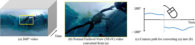 一般的な360°、実写VR動画を観る場合、その一部を切り取って2Dディスプレイに表示して見る。これはHMD(ヘッドマウントディスプレイ)を用いても状況は同じで、一度に360°全面を観ることはできず、視線方向、注目しているもの、頭の動きによって、ある一部分を切り取ってみることになる。YouTube等でも360°動画を観ることができ、左右に視点を動かしてみることができるが、その際も一部切り取られた正面の映像のみで、後ろ側になにか重要なものが映っていたとしても気がつかない。