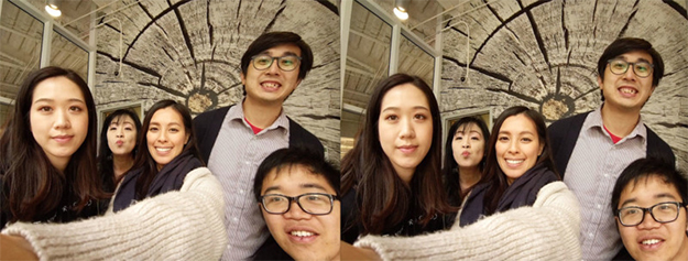 集合写真で端に写っている人の顔が歪んでみえる現象を緩和するための技術。最近のスマートフォンに搭載されているような広角のカメラで撮影した場合、画像周辺部分が歪んで撮影されてしまいます。これが風景などの場合それほど気になりませんが、人の顔の場合、とくに違和感を感じてしまいます。