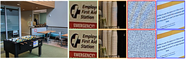 スマートフォン向けの撮影写真を高解像度に補正する技術。バーストモード(連写)で撮影した画像から、わずかな差異やわずかな手ブレを利用して、補正を可能にする。従来から、ビデオカメラで撮影した動画をもとに高精細な画像を再構成する手法は知られていたが、それをスマートフォンカメラ向けに最適化したのが本研究。グーグルのフラグシップスマートフォンPixel3のカメラ機能Super-Res ZoomやNight Sightモードで使われている技術。
