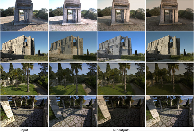 野外のシーンで撮影した動画像を、日照条件の違う時に撮影したかのように、照明環境を修正・合成する技術。昼間に撮影した映像にフィルターをかけたり、色調調整して夜に見える映像として編集することは可能だが、本研究では、太陽光が照らしている方向や、影が伸びる方向や様子などまでが自由に変更できる。