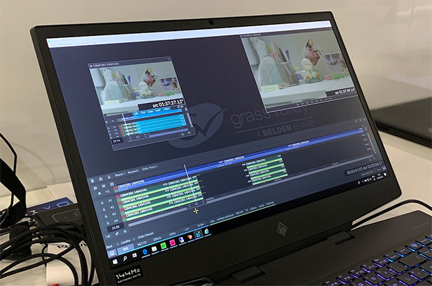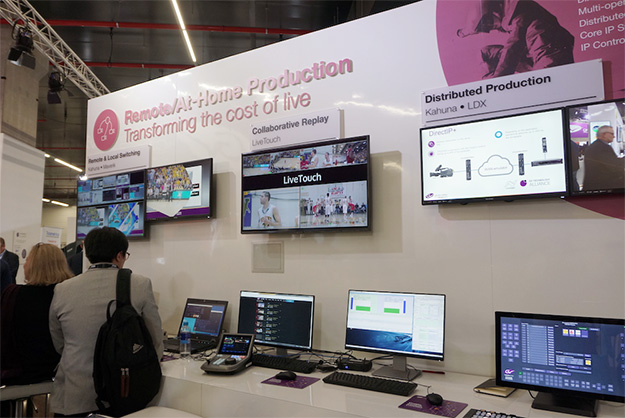 欧州各国で進展するリモートプロダクションのさらなる省力化がテーマということで、すでに導入が進んでいる世界各地でのリモートプロダクションからのフィードバックに応える形で、様々な提案とデモが行われていた。「Transforming the cost of live」と称したコーナーでは、現在問題となっている現場での人員の配置と、ネットワークの数を解消する取り組みを紹介。IPを利用したわかりやすい利用例として、これまで現場と局舎の2式必要だったものを、機材の大半は現地に送り込み、スタジオのスイッチング操作をパネルのみを局舎に残す形で余計な設備投資なしでライブ現場を実現できるソリューションを展示していた。