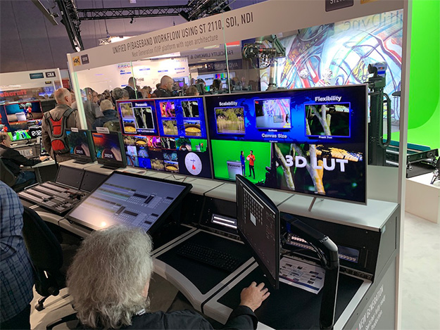 これはタッチパネル式のコントローラーを中心に、ST2110準拠のIPプロトコルから、従来のSDI信号、ライブ配信などでスタンダードになっているNewTek社のNDIプロトコルまでを、1つのパネル上で扱えるシステムを構築できるというもの。従来のスタジオカメラやPTZカメラの映像リソースはもちろん、今年のNABでも紹介された8Kカメラからの切り出し映像や、PCからのプレゼンテーション映像のコントロールまで全ての映像リソースが対象だ。