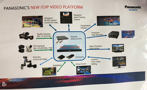 パナソニックがこのIBCで全面的に押し出してきたのは、ライブイベントなどの現場で従来の放送スイッチャーで単にカメラの映像信号だけをコントロールするという概念から脱し、会場に存在する全ての映像リソースを、IT/IPで統合的かつ包括的に管理・コントロールできる「Next Generation IT/IP Plastform」というシステム概念を全面に打ち出した。