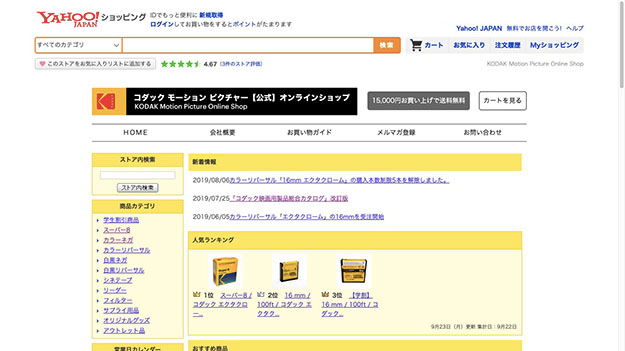 フィルムは、コダックに電話、メール、またはインターネットのYahoo!ショッピング内「KODAK Motion Picture Online Shop」で購入できます。コダックによると、店頭で購入を希望される場合は、事前に連絡がほしいとのことです。店頭には在庫はそれほど量はないので、予約をいただければ都外の倉庫から店頭の倉庫にフィルムを転送させておくことでお渡し可能とのことでした。