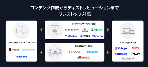 AWSブースでのパートナー出展は17社。AWSは、メディアの制作から発信するまでのワークロードを、「コンテンツ制作&ポストプロダクション」「コンテンツ&ワークフロー管理」「コンテンツ配信&送出」「機械学習&データ分析」と、4つのカテゴリーに定義し、各分野においてクラウドを利用したメディアソリューションを提供している