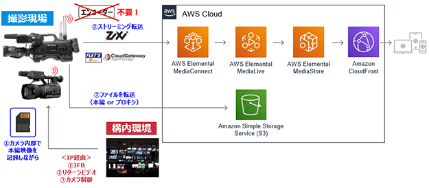 CONNECTED CAMの最新ソリューションとして、AWSクラウドサービスを活用する制作環境をAWSブースのコンテンツ制作コーナーで紹介。CONNECTED CAMに搭載している撮影クリップが生成される毎に自動でアップロードされる「オートFTP機能」を使い、AWSクラウドへダイレクトにアップロードができる。クラウドに転送した撮影クリップは、対応するノンリニア編集システムで遠隔編集が可能となり、即時性の高い素材を短時間で制作する環境が実現する。