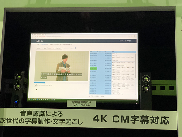 クラウド音声認識サービスを使い、字幕制作および文字起こし作業を支援するサービス「NeON-CA(NeONクラウド・アシスト)」を実演で紹介。映像ファイルの音声を、GoogleやSpeechmatics、Microsoft Azureといった音声認識サービスを使って音声認識し、朋栄IBEが開発した地上デジタル・アナログ用字幕放送画面制作システムNeONをベースに字幕ページと文字起こし情報を自動生成する。