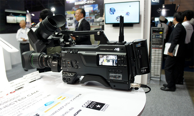 JVCケンウッド4KメモリーカードカメラレコーダーGY-HC550。双方向のライブストリーミング機能を搭載しており、同一回線上でカメラからのライブストリーミングを中継しながら、スタジオ局からの番組映像とインカム音など同時受信できる