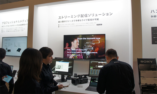 特にカメラメーカーは独占に近い状態で、今回もソニーからマルチフォーマットスタジオカメラHDC-5000のほか、XDCAMショルダーカムコーダーPXW-Z750などが新製品として出展されたほか、パナソニックは2/3型ショルダーマウントタイプのAJ-CX4000GJ、JVCケンウッドは4KメモリーカードカメラレコーダーGY-HC550/500が出展された。こうしたカメラはIP対応やネットに対応したものとなっており、クラウドを利用した制作にも対応している。