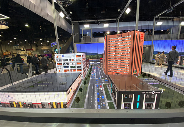 BELLがどのように「ドローン技術を活用したスマートシティ」を表現したのか?それは、LEDパネルとプロジェクションで構築されたミニチュアの街をつくり、中型の汎用のドローンを同様に「ミニチュア」として模型の中を飛行させて、建物の上のヘリポートからヘリポートへと飛び回る。建物の模型などはちょっとチープだが、非常に目を引き、「ドローン技術を活用したスマートシティ」のイメージがストレートに伝わってくる。医療機関や運送会社など、提携期間で情報を共有し、必要なときにドローンが物資や人を運ぶ。その様をわかりやすくシンプルに伝える、魅力的な展示だっとことはいうまでもない。