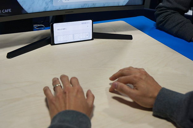 もう一つサムスンがEureka Parkで展示していたのが「Selfie Type」というスマートフォン用のタイピングアプリである。スマートフォンのインカメラで指の動きを認識して、文字入力を行うというもの。使用時は最初だけ指の位置をキャリブレーションする必要がある。