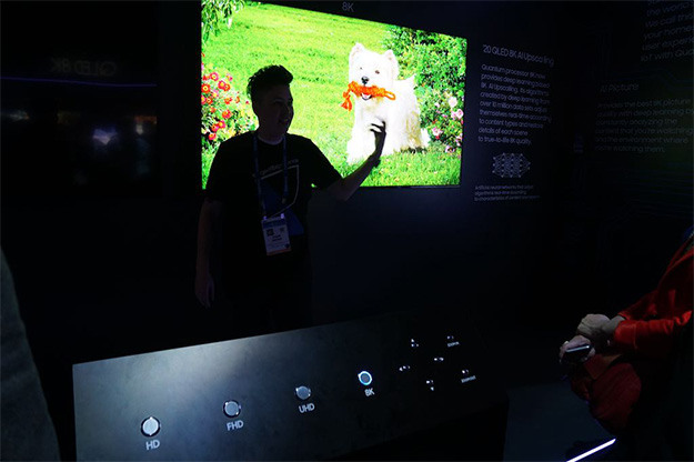 サムスンブースでは2Kソースを8Kディスプレイにアップコンバートして表示し、比較を行っていた。素人目には、ではなく誰が見てもアップコンでも十二分に綺麗に見えるし価値がある。