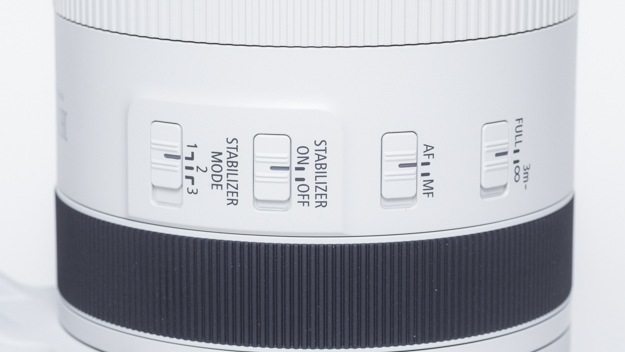 鏡胴のスイッチ類はこれまでのズームレンズと同等のものが見られる。「撮影距離範囲切り替えスイッチ」「フォーカスモードスイッチ」「手ブレ補正スイッチ」「手ブレ補正モード選択スイッチ」