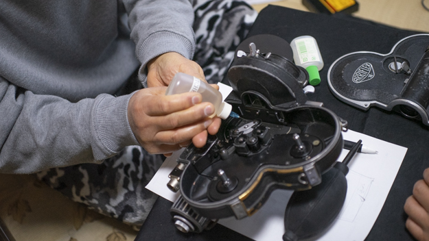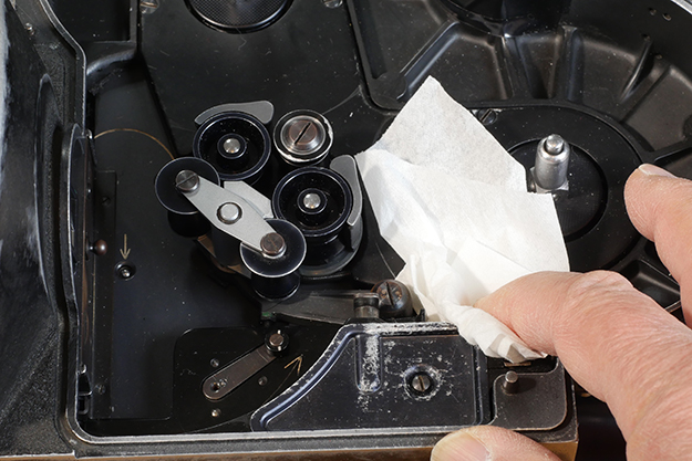 例えば、フィルムゲートに砂粒があると、100フィート全てに直線の傷が付く。また、フィルムゲートそのものの傷は指で触って確認する。傷はラッピングしないとカメラが使えないので、その点検も兼ねて丁寧に行う。
