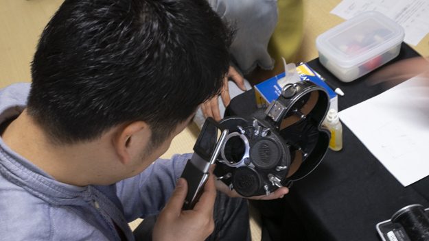 早速、石原さんからフィルム装填のおさらい。最初の1回は、明るい環境で、目視しながら、確実に装填して手順を思い出す。次に、ダークバッグで3回連続して同じ状態で装填できれば卒業。