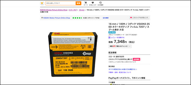 例えば、「yahoo kodak」(写真1)のキーワードで検索すると、「KODAK Motion Picture Online Shop」(写真2)が出てくるので、「コダックモーションピクチャー公式オンラインショップ」(写真3)へ行くと、フィルムの種類と価格が載っている。