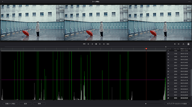 RAW素材の編集の流れを紹介すると、視聴環境はまだRec.709が主流という前提になると思う。編集プロジェクトをRec.709とした時、RAW素材をインポートするとだいたいライブラリに並んだ素材が白飛びした状態になる。この問題はライブラリの色処理をWide Gamut HDRに設定する方法や、Log変換する方法などで防ぐことができるが、筆者は白飛びしたままでもそのままタイムラインに並べている。