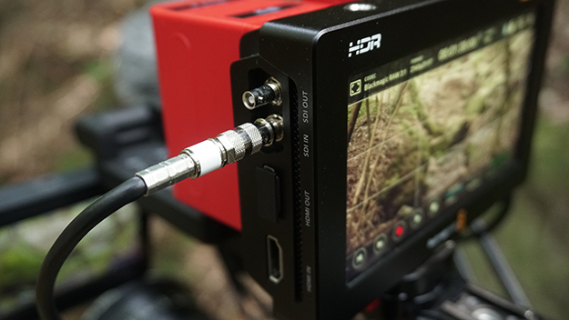 C300 Mark IIとVideo Assistをつなぐケーブルは、マイクロBNCの50cmタイプを使っている。なるべくスッキリと短くしたいので、C300 Mark II側のREC OUT端子はL型のプラグでコードをすっきりさせている。Video Assist本体のSDI端子はマイクロBNCで、従来5インチタイプのVideo Assistのコネクターとは互換性はない。