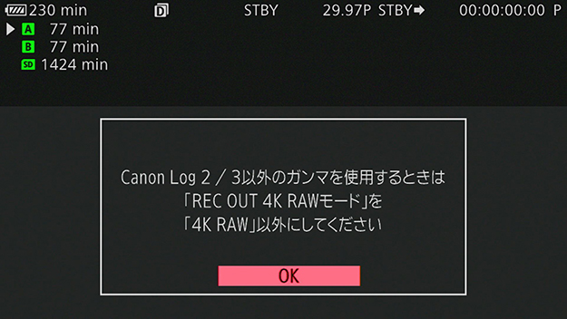 C300 Mark IIのRAW収録は、記録モードを「通常記録」に設定していることが前提となる。C300 Mark IIは特殊記録の記録モードとして「Slow&Fastモーション(CROP)」で120fpsも選択できるが、その場合RAW出力は「不可」となる。RAW信号の出力は「REC OUT端子」だけでなく、設定により「MON端子」からもRAW信号の2系統からRAW出力が可能だ。