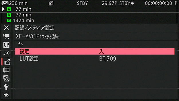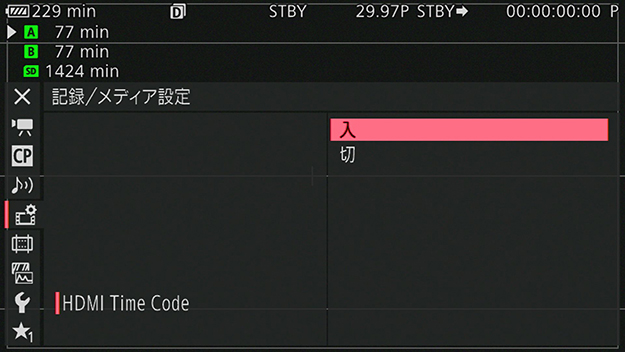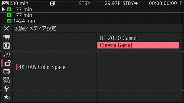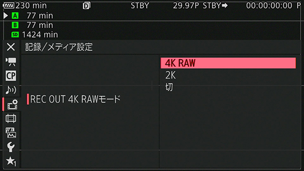 これらの設定を行って分かったことは、RAW出力が2系統となることに加えて、カメラ側CFastカードのダブルRECをON、プロキシ収録をON、HDMI OUTにREC機をつなぐと、それら全てが同時に収録かつ、コントロールできるということだ。