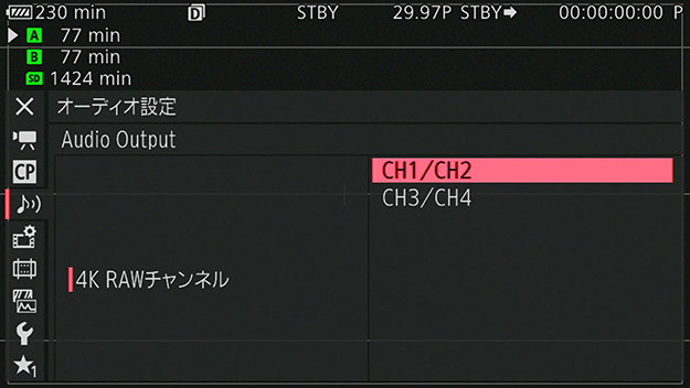 C300 Mark IIの音声収録は4chだが、RAW OUTは選択式となる。