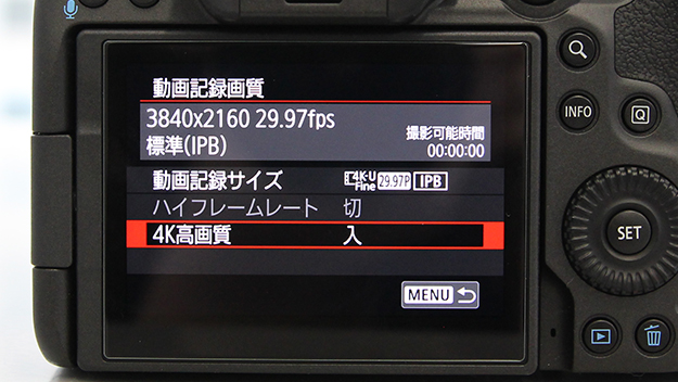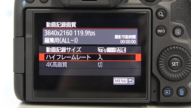 「ハイフレームレート」と「4K高画質」設定は両立しない。また、共にフルHDの記録解像度は設定できず、4K120Pのハイフレームレート記録は29.97固定のフレームレートとなる。HDMIアウト出力は59.94Pの映像が出力される。記録のフレームレートと出力のフレームレートが異なる点は注意点か必要だ。ここのあたりはCINEMA EOS SYSTEMなどの業務用カメラと違って、スチル機がベースである故だろう。