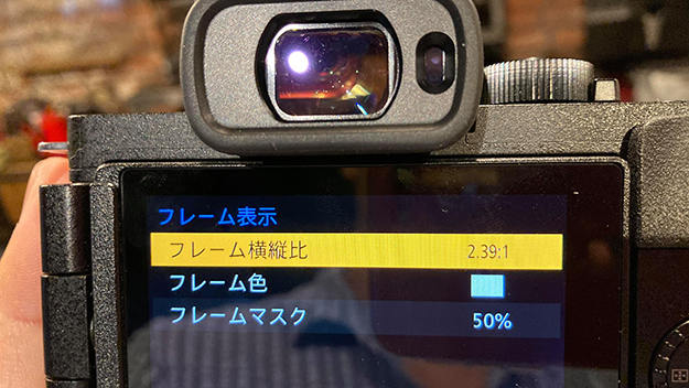 これまでのフレーム表示に加えてガイドライン表示が追加されているのも特徴。動画は16:9で録画されることに変わりはないが「2:39:1」「2.35:1」「2.00:1」「1.85:1」「16:9」「4:3」「5:4」「1:1」「4:5」「9:16」など、ガイドラインを液晶に重ねることが出来る。このラインの色は10色から選べ、フレームマスクとして透明度を「100%」「75%」「50%」「25%」「OFF」から選ぶことも出来る。小さいボディなのにシネカメラのような感じで心憎い。