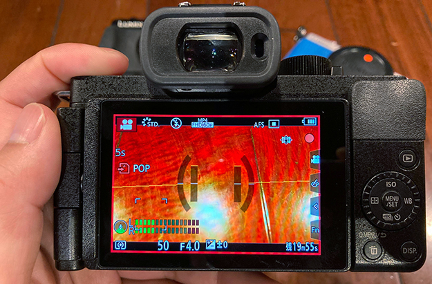 背面のDSPボタンで表示内容は切替えられるが、特にマイクレベルのメーターが細かいのがいい。緑、オレンジ、赤と色分けされているうえに液晶の半分を占めているので自撮りをしながらも音のレベルが適正かどうかを確認できる。