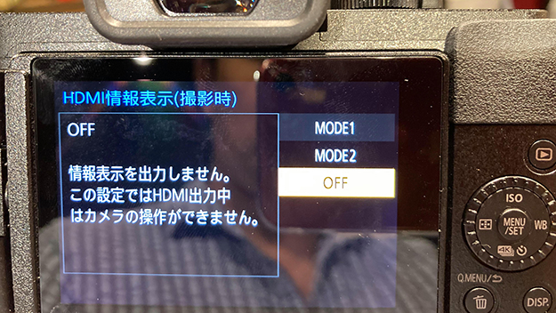 外部出力はマイクロHDMI端子で、情報表示は「常に情報表示」「カメラを操作したときだけ情報表示」「常にOFF」が選べる。ただし「常にOFF」を選択した場合はHDMI出力中にカメラの操作が出来ない仕様。ライブ配信に使う場合は設定を決め打ちにする必要があり惜しい。小さなボディでビデオ回路に制約があるのか?GH2に戻ったような気分で残念である。そのあたりをHDMI出力中もフルコントロールしたいならGH5を選択するのが良いのだろう。