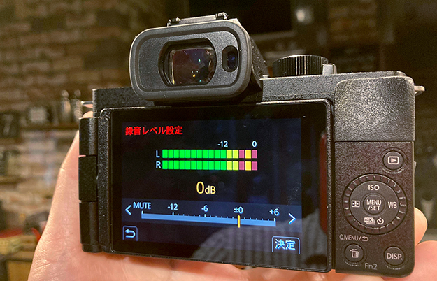 外部マイクはプラグインパワーの3.5mmステレオミニジャックがあり、録音レベル設定もマニュアルで可能。「MUTE」「-12dB」から「1dB」単位で「+6dB」まで設定できる。録音レベルメーターは「ON」「OFF」があるが、位置は変えられず液晶の左下に表示される。ただしヘッドフォン端子がないため、本体だけでは録音レベルをライブで確認することが出来ない。HDMIからアウトしてスイッチャーや外部レコーダーで確認するのが良いだろう。