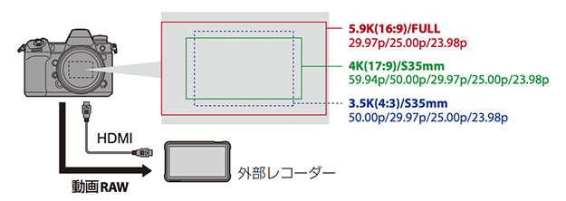 S1H取扱説明書より。最大5.9Kの解像度、12ビットの動画RAWデータを対応した外部レコーダーにHDMI出力できるようになる