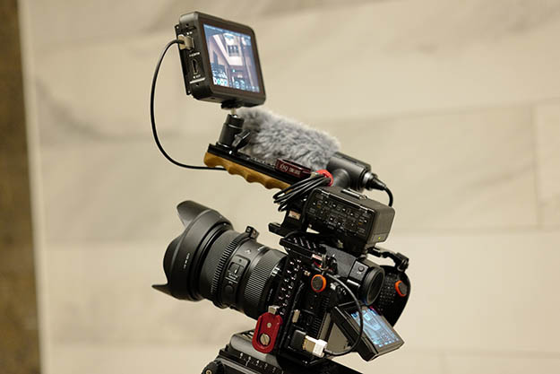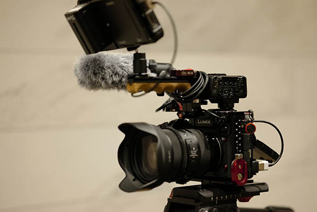 S1Hはミラーレススチルカメラの形をしたシネマカメラということで、そのままでは正直なところ運用しにくい。そこで、筆者はZACUTOのリグでビルドアップしている。センターハンドル部に自由雲台を介してNINJA Vを配置することで、バランスを取ってホールドしやすくしている。