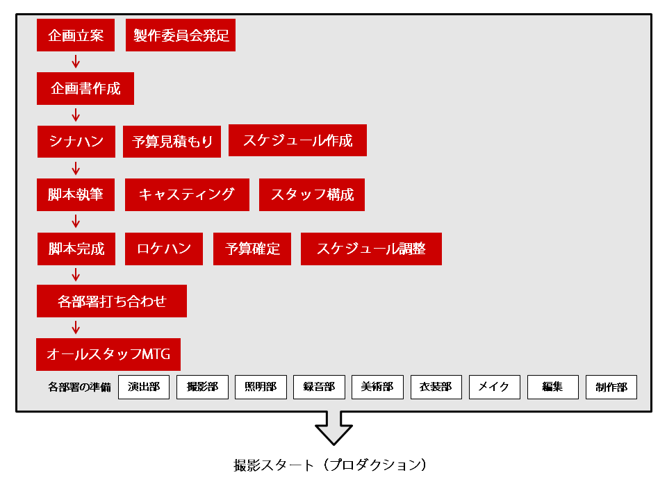 映画は「プリプロダクション」「プロダクション」「ポストプロダクション」と3つのパートを経て完成する。今回は映画製作の“準備段階”にあたる「プリプロダクション」について紹介していく。この準備期間が作品にとってとても大事なのだ。映画製作のプリプロダクションの流れは以下の図の通り。