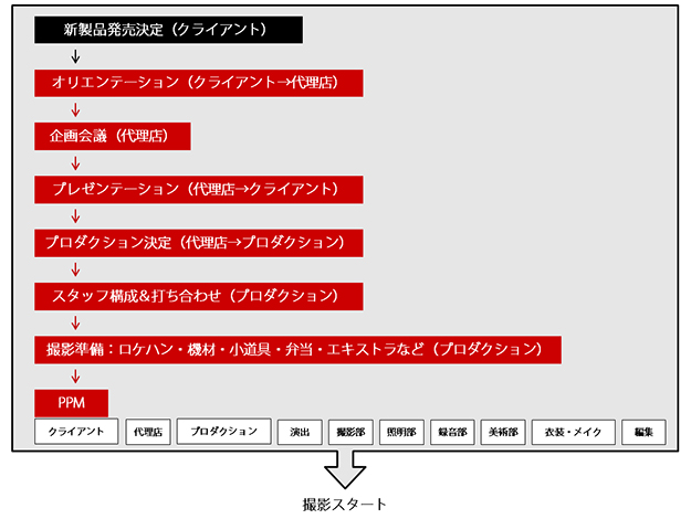 クライアントから制作代理店が決定すると、最終のクライアント(広告主)・広告代理店・制作会社の担当者や制作スタッフのうちプロデューサー・制作・ディレクターなどが撮影前に実施する会議「PPM(Pre Production Meeting)」が行われる。