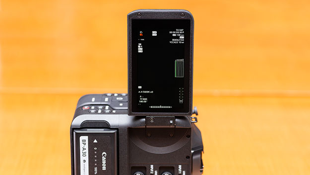 さらに、C70はハンドルグリップ側にネジ穴を設けておりまして、L字型のリグなしで縦撮りが可能です。本体を縦にするとOSDも90°回転して作業しづらくなるのですが、C70ではOSDを90°または270°ローテートする機能を搭載しています。縦の状態でも画面と周辺情報をきちんと確認しならが、撮影を可能にしています。