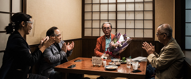 事の始まりは、最初にJSCの浜田理事長に、JSCとしてのX-CINEMAへの協力を申し入れたとき、どんな内容をやるかの話し合いで、やはりアーカイブとして後世まで残るようなコンテンツで、しかも今まで見たことがないようなもの、という話が出た。その際にやはり最初は「大作さんしかいない」と、木村大作さん出演の推薦をしてくださったのは、浜田理事長だった。その際にご自分が聞き手として出演も申し出て頂き、さらに、お二人が長年通う祖師ケ谷大蔵駅前の行きつけの飲み屋「やりとり たかはし」もロケ地としての会場提供をご快諾頂き、今回の開催に至った。