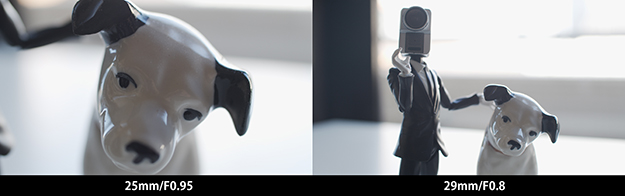 NOKTONシリーズはこれまでF0.95という驚異的な明るさが大きな特徴だったが、今回はそれをも上回るF0.8。そこで今回は最も焦点距離の近い25mm/F0.95と比較をしてみた。スタンドライトと、小型のLED電飾を付けただけの、比較的暗い部屋で比較撮影。なおカメラはBMPCC4K、SSは1/100、ISOは400に設定した(比較しやすいように25mm/F0.95側はブローアップし29mm/F0.8と画角を合わせてある)。
