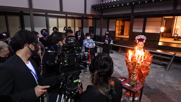 ワークショップでは新しいSignature ZoomとSignature Primeを、2台のALEXA Mini LFを使って同時に撮影してお互いを比較検証して見せたいと思っていました。それぞれの特徴を見せられるシナリオとセットを作ってテストできれば素晴らしいと思いました。もちろんそこにSkypanelやOrbiterを使った状態も見せたかったのですが、杉本さんと相談した時に、同時に照明も雷のシーンの表現には(京都の)伝統的なライティングシステムも、同時に使って比較してみるのはどうか?というアイデアを頂き、それはいい!と思いました。