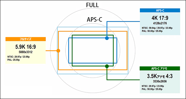 | 4K | APS-C | 4128×2176 | 17:9 | 59.94P/50.00P/29.97P/25.00P/23.98P | 12bit | LPCM |