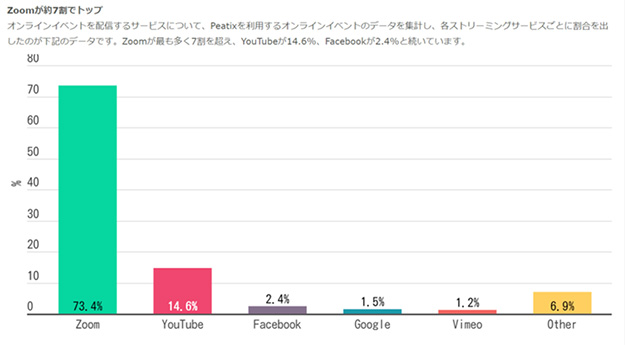 Peatix Japan株式会社が発表した「2020年 オンラインイベントに関する調査」によれば、イベント管理・チケット販売サービス「Peatix」で告知されたオンラインイベントが「利用している動画配信サービス」のトップは「Zoom」で、73.4%と圧倒的な数字を示しています。