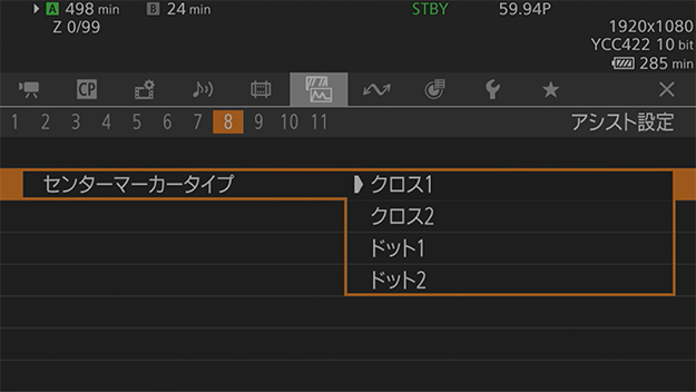 なお、XF605のマーカー系は非常に充実しており、アスペクトマーカーやセーフティーマーカー、グリッドマーカーの各設定はもちろん、センターマーカーもその形状が4タイプから選べるなど、ENGカメラ並みの充実ぶりだ。ユーザーマーカーも含めて至れり尽くせりなだけに「なぜ100%マーカーを用意してないし?!」となったわけだ。