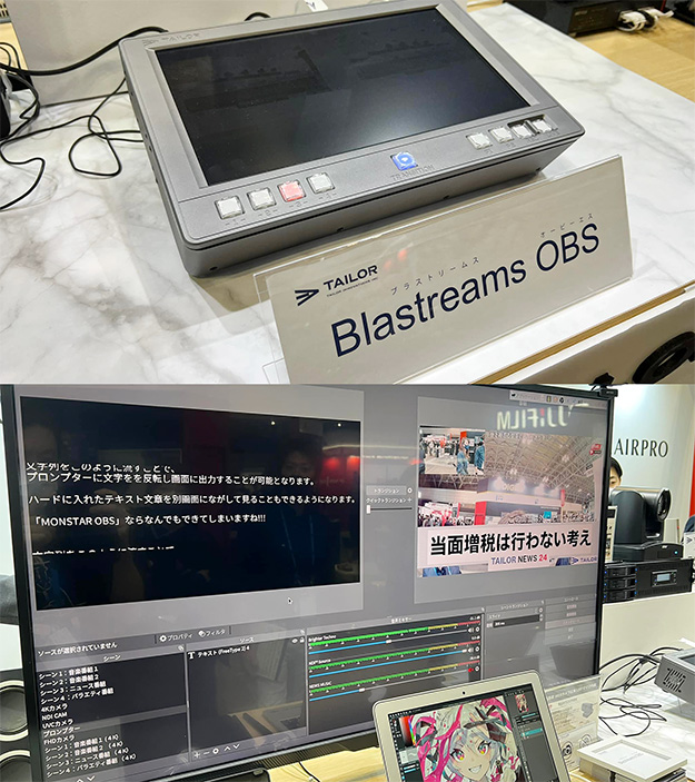 最初に訪れたブースは、テイラーイノベーションズの「Blastreams OBS(ブラストリームス オービーエス)」。Linuxベースで稼働する本機は、本体背面にHDMIやSDI入力端子を備えた、まさに「OBS Studio専用機」。