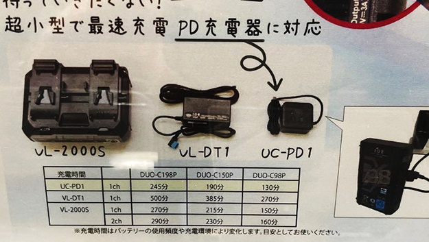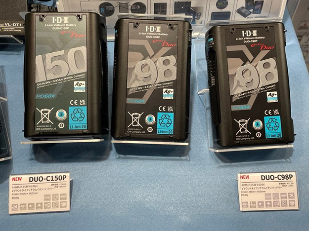 IDXブースに出展されていたUSB-PD対応のDUO-CPバッテリー、これまでの純正チャージャー VL-2000Sよりも圧倒的小型かつ安価で、充電時間はさらに短縮されており、良いことづくめ。コンセントは2口必要だが、この充電器を2本用意すれば十分に代わりになる。出張ロケなどで役に立ちそうだ。