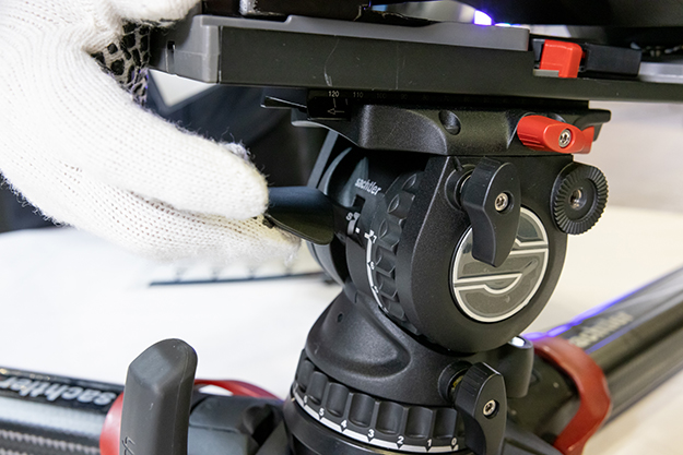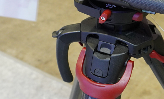 多くのビデオ雲台は水平出しをする際に雲台の下に伸びるノブを緩めて角度調整を行うが、aktivは雲台横にあるレバーを上に上げることで角度調整が可能。ノブが下に出ていないことで、三脚を地面に直置きするような低い高さでの運用が可能になる。