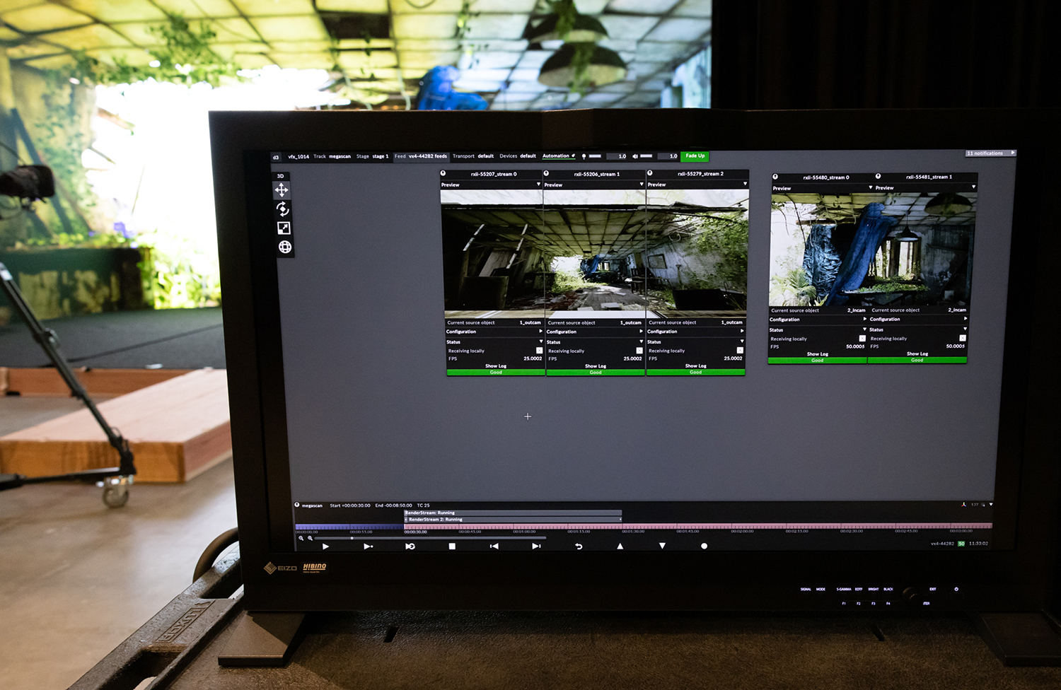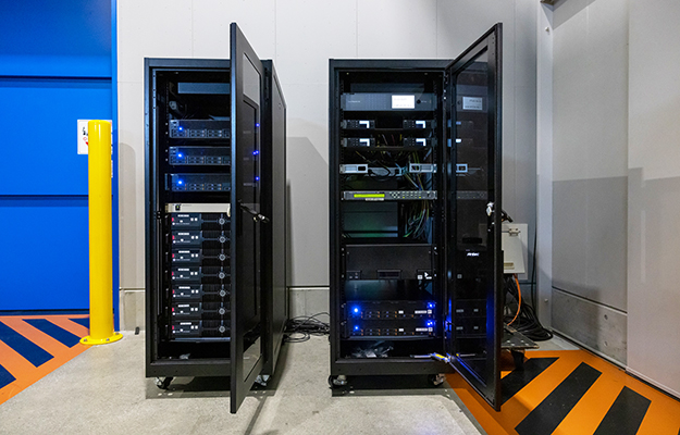 背景に表示させる3Dアセットをレンダリングしているメディアサーバーを、rxからGPUにNVIDIA A6000を使用するrxIIにアップデートし、さらにインナーフラスタム(カメラが撮影しているエリア)でrxIIを2台、アウターフラスタム(外側の環境光や映り込み用の映像)でrxIIを3台使用しています。また、LEDプロセッサーへのアウトプット等全体のコントロールを担っているメディアサーバーvx4とrxIIとの間を100Gで繋いでいます。