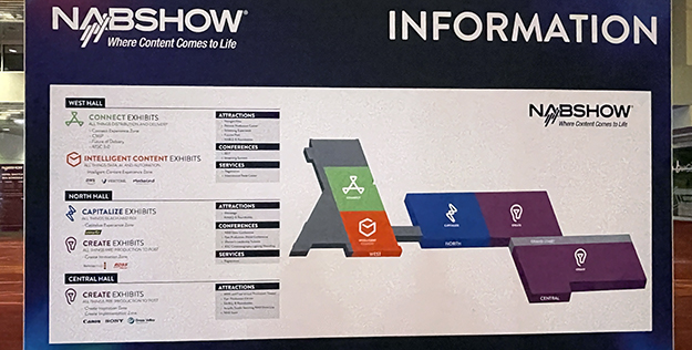 LVCC(ラスベガスコンベンションセンター)に新ホールが誕生しました。Westホールは今年のCES2022でお披露目され、今回のNAB2022でもメインホールとして案内されています。屋外の大型広告はWestホール以外影を潜めてしまいました。会場構成も変化しています。今回は、「Central」、「North」に加えて新設の「West」の3つのホールで開催されます。NAB運営側も新コンセプトを掲げ、「CONNECT」「 INTELLIGENT CONTENT」 「CAPITALIZE」「 CREATE」と4つのカテゴリーでわかりやすい展示となっています。